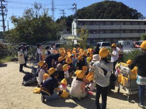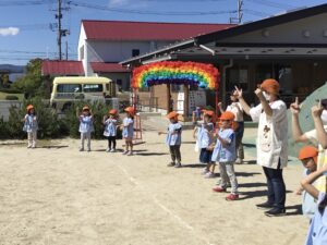 また、地震を想定した避難訓練も行いました。驚いた表情をしたり、ちょっぴり泣いてしまったお友だちもいましたが、落ち着いて避難し、保育者のお話を聞くことができました。
