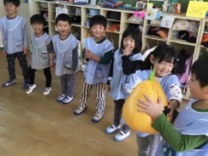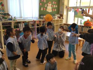 3~5歳児クラスのお友だちは、”英語であそぼう”に参加し、ハロウィンの曲に合わせて”ゆっくり””スピードアップ””反対回り”等とお隣のお友だちにかぼちゃのおばけをお渡ししたり、”トリックオアトリート”と先生にお伝えしてハロウィンのシールをいただいたりと楽しい時間を過ごしました!