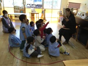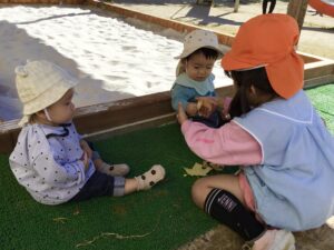 ばらぐみのお姉さんが、ひよこぐみのお友だちに落ち葉を見せてくれる可愛らしい場面がありました!