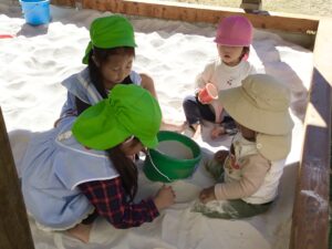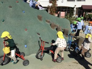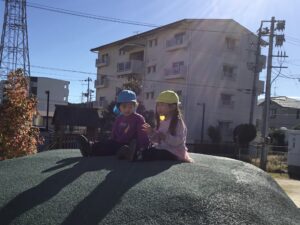 築山の上でお友だちとお話をしたり、三輪車やお砂遊びなど、それぞれ好きな遊びを楽しんでいました!