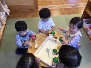うさぎぐみさんでは、おままごとコーナーでアイス屋さんになりきったり、スプーンですくって食べる真似をし、「おいしいね!」とお友だちと顔を見合わせる姿がありました♪