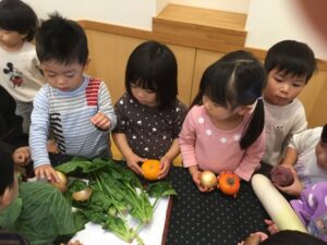 お礼拝後に実際にお野菜や果物に触ると、「いい匂いする!」「キャベツ大きいね!」などと言うお友だちの姿がありました!