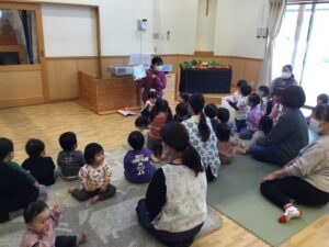 昨日は0~2歳児クラスはホールで、3~5歳児クラスは教会にて”収穫感謝礼拝”を守り、牧師先生から聖書のお話や絵本を通してお話を聞きました。