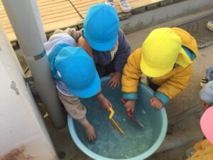 朝、園庭に行くと色水の入ったカップや、タライが置いてあり、「なんだろう?」と興味津々なお顔をしていた小さいクラスのお友だち。