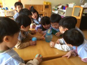 たんぽぽさんのお部屋では、みんなで何かを観察していました!
